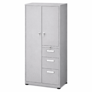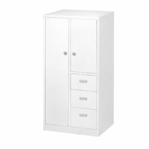 Archivero mixto, compuesto por una puerta tipo gabinete con tubo para colgar y entrepaño inferior. En el lado contrario integra una puerta abatible en la parte inferior, 2 cajones papeleros y 1 gaveta de archivo tamaño oficio. Diseño resistente, seguro y funcional, ideal para oficinas, corporativos o áreas administrativas.