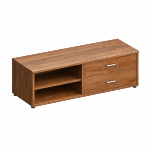 Credenza lateral baja con un cajón lapicero y uno de archivo, un hueco con entrepaño fijo con separación intermedia en el hueco inferior, cajones con correderas de extensión embalinadas reforzadas. El hueco inferior cuenta con una medida mínima de 30 cm de altura para carpeta Lefort.