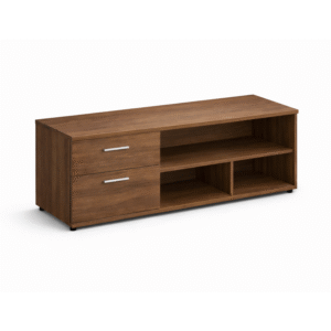 Credenza baja lateral con un cajón lapicero y uno de archivo, en ambos costados un entrepaño fijo formando dos huecos, con correderas de extensión embalinadas reforzadas. El hueco inferior cuenta con una medida mínima de 30 cm de altura para carpeta Lefort.