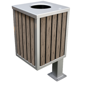 Bote de basura diseñado para espacios urbanos, institucionales y áreas públicas, ideal para proyectos que requieren alta resistencia, durabilidad y bajo mantenimiento. Su combinación de acero y madera plástica ofrece una solución robusta y estética para exteriores de alto tránsito.
