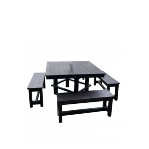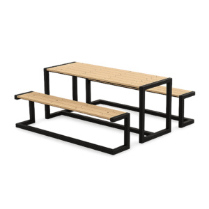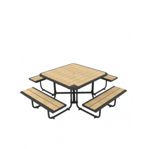 Superficie y asientos: elaborados en plastimadera, combinando la calidez visual de la madera con la durabilidad y facilidad de mantenimiento del material plástico.