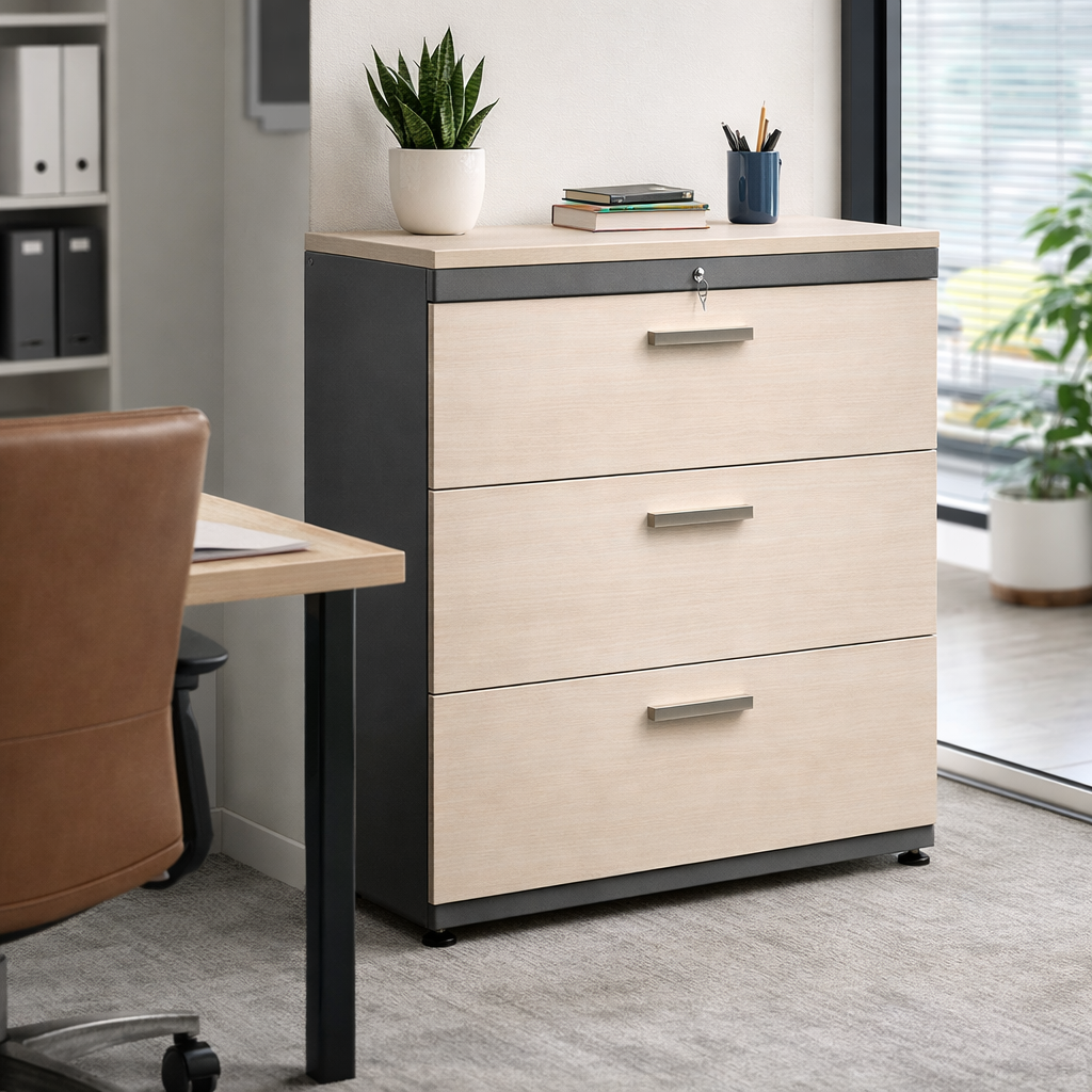 Archivero horizontal combinado, con cuerpo metálico y frentes de cajón y cubierta fabricados en melamina de 16 y 28 mm, en color a elegir. Diseño resistente, seguro y funcional, ideal para oficinas, corporativos o áreas administrativas.