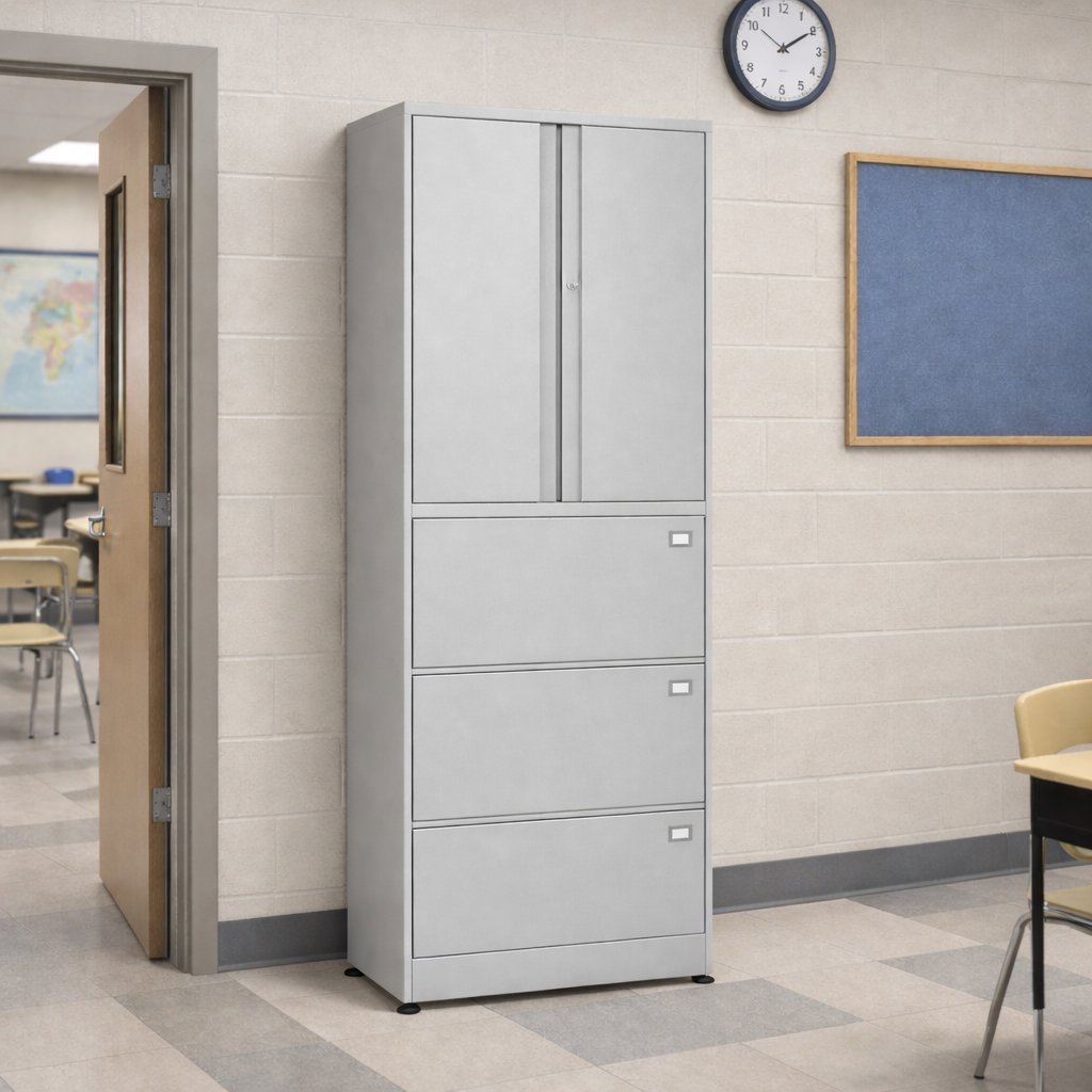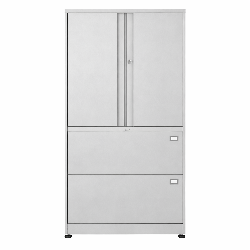 Archivero horizontal mixto, con 2 gavetas horizontales tamaño carta/oficio y 2 puertas abatibles que integran 2 entrepaños móviles. Diseño resistente, seguro y funcional, ideal para oficinas, corporativos o áreas administrativas.