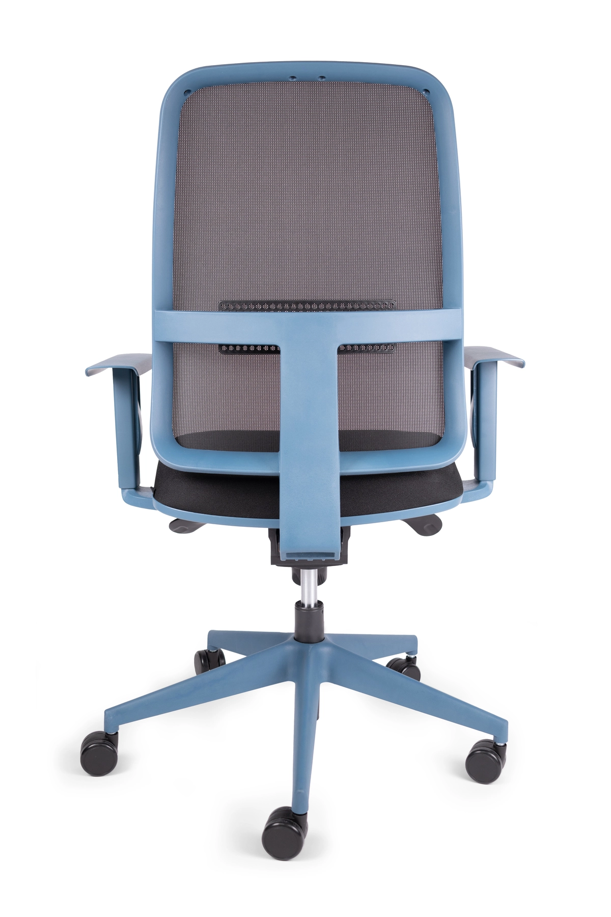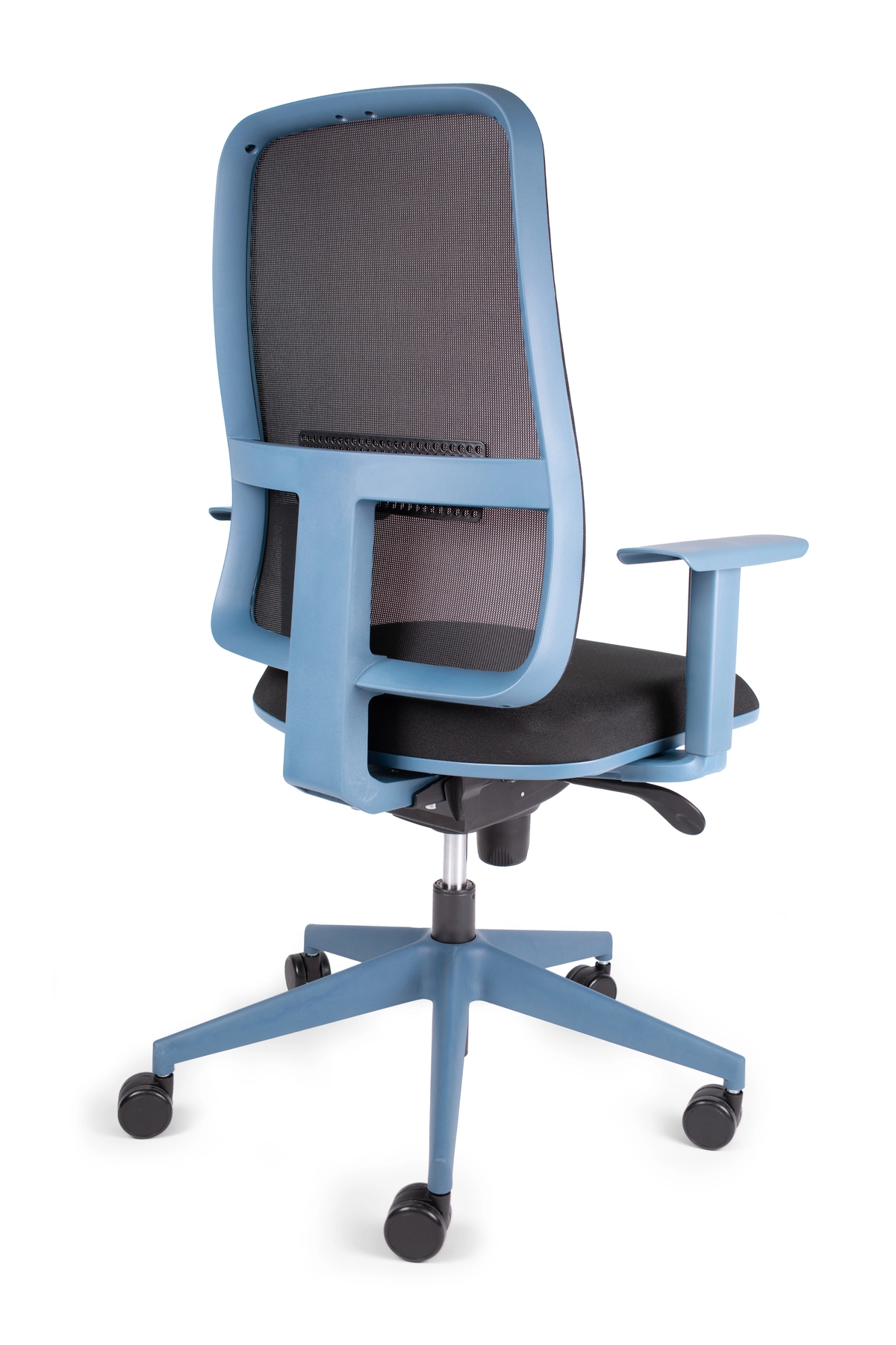Respaldo: Bastidor interno de polipropileno de alta densidad, soportes en forma de “L” ensamblados al bastidor por un extremo y por el otro se fijan con el asiento en material de fundición de aluminio con terminado en aluminio pulido, tapizado en malla de elastano, sujeta por un liner en todo su perímetro, soporte lumbar ajustable.