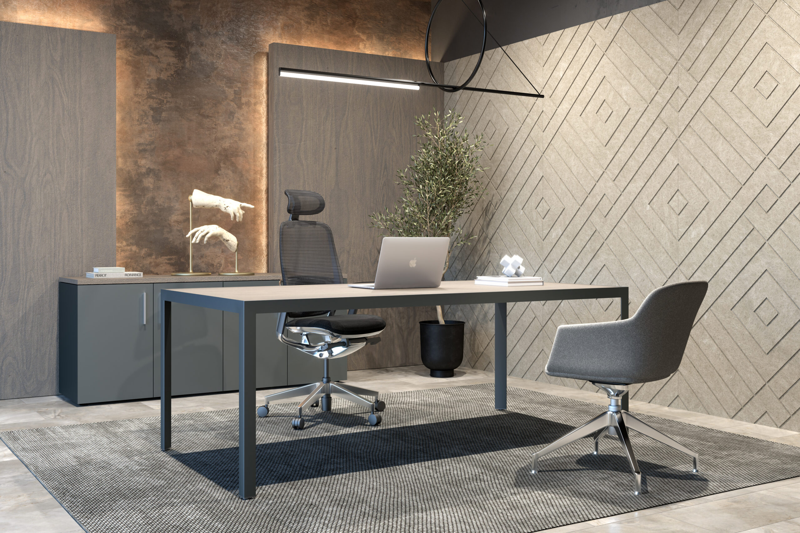Escritorio para dirección con estructura perimetral de aluminio con patas en acero Diseño resistente, seguro y funcional para oficinas o escuelas.