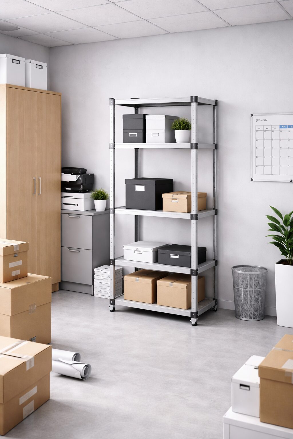 Estantería metálica diseñada para almacenamiento en oficinas, bodegas y áreas de archivo. Su estructura permite organizar materiales, cajas, archivos o equipo ligero, optimizando el espacio y manteniendo un acceso práctico a los objetos almacenados.