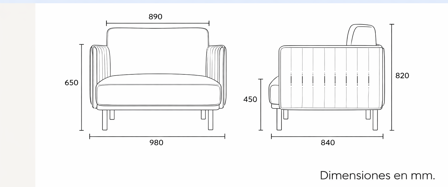 - Estructura: bastidor de triplay de madera de haya 1/2” (12mm) estofada refilados y canteados, brazos y respaldo en cuerpo de por triplay en madera de haya de 1ª de 12 mm de espesor, uniones fijas con adhesivo y grapas de acero, frentes, brazos y respaldo con recubrimiento de espuma firme en poliuretano flexible.