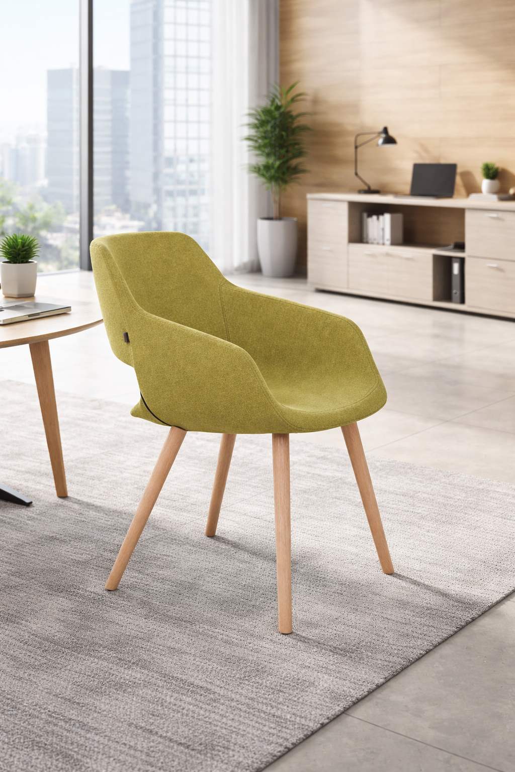 Silla de diseño contemporáneo ideal para espacios corporativos, salas de juntas y áreas de espera ejecutivas. Su estructura tipo trineo en acero brinda estabilidad y durabilidad, mientras que el asiento y respaldo tapizados ofrecen confort y una imagen elegante.