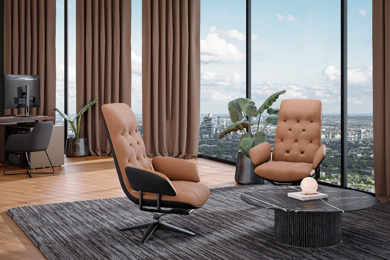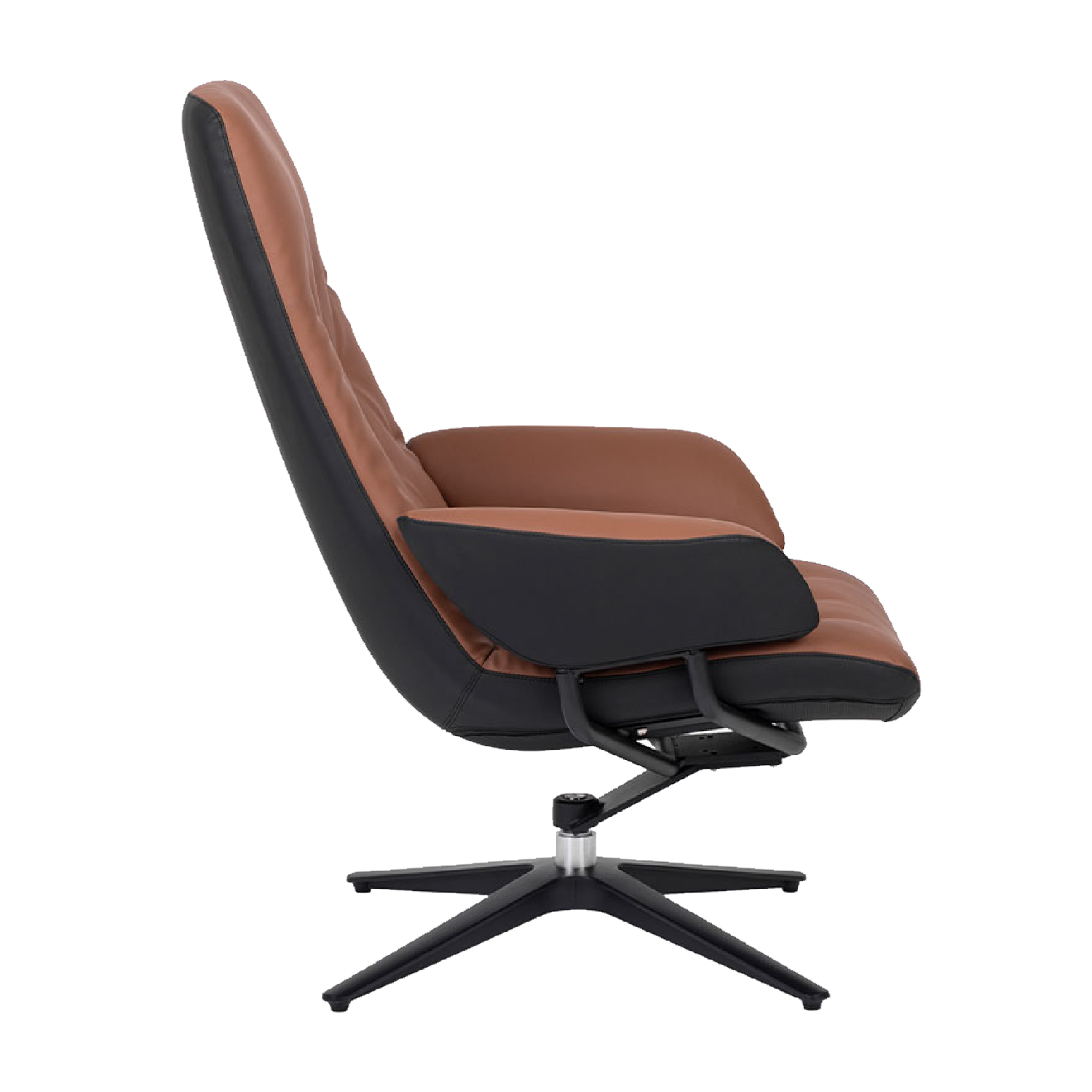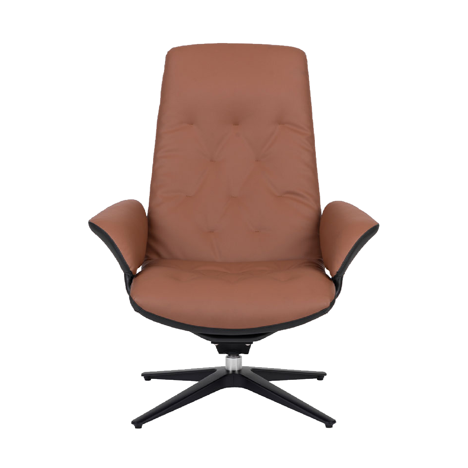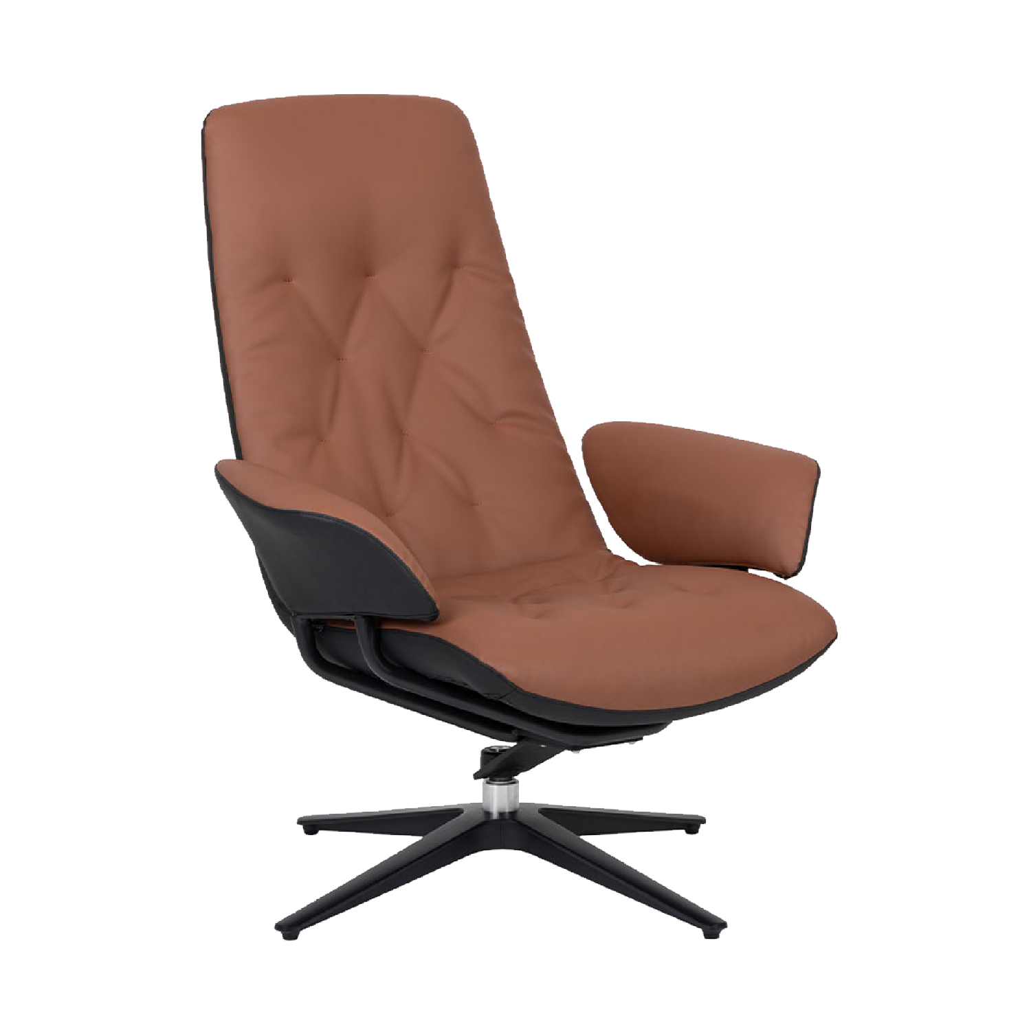 Sillón ocasional con base de aluminio de 4 puntas pintada en negro y mecanismo giratorio de acero al manganeso que aporta estabilidad y movimiento suave.
