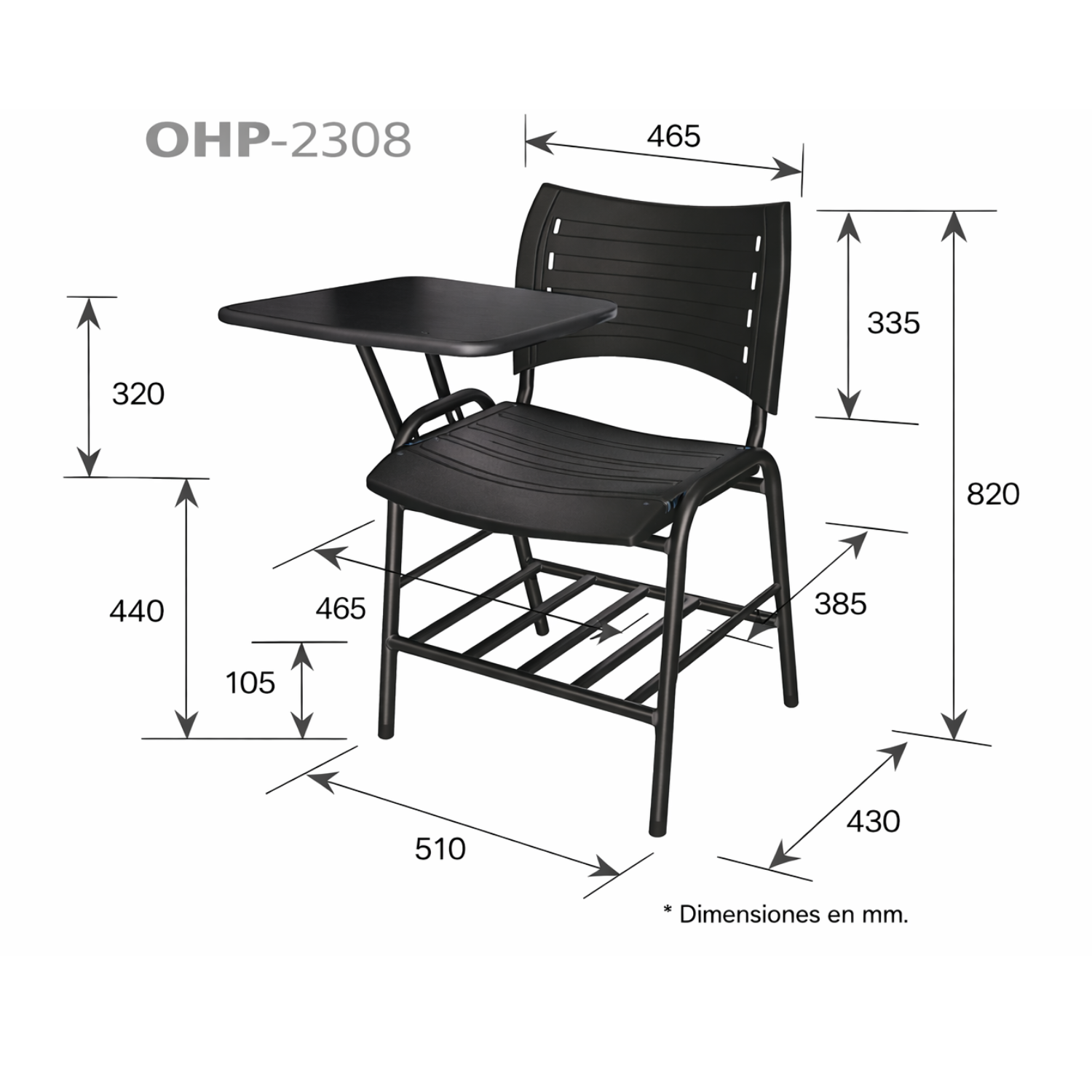 Cuenta con estructura tubular de acero calibre 18 con acabado en pintura electrostática negra, asiento y respaldo en polipropileno de alta resistencia con perforaciones ovaladas para mayor comodidad, y una práctica parrilla inferior metálica para almacenamiento.
