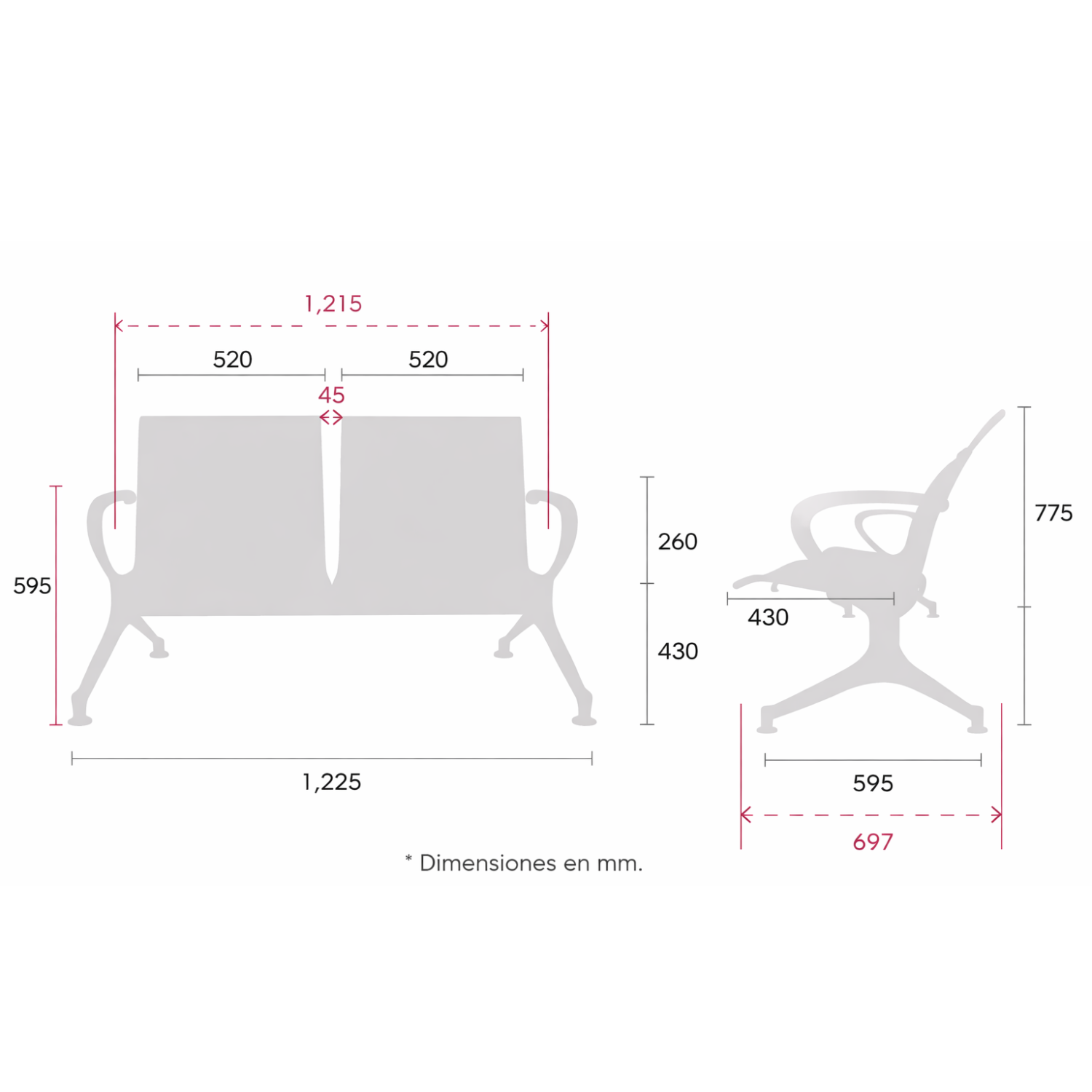 Su diseño modular de dos plazas optimiza el espacio sin sacrificar confort. La base reforzada garantiza estabilidad y durabilidad incluso en uso constante. Además, los materiales metálicos facilitan la limpieza y desinfección, convirtiéndola en una excelente opción para entornos donde la higiene es prioritaria.