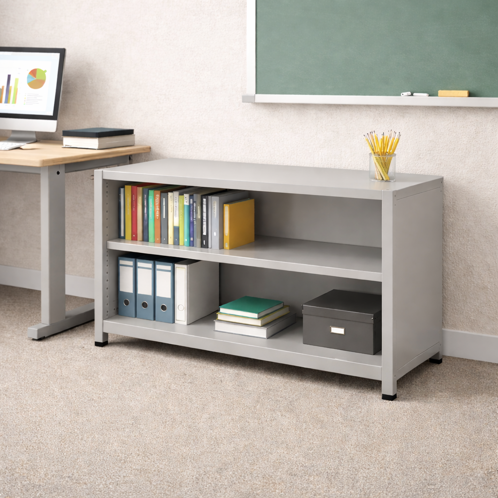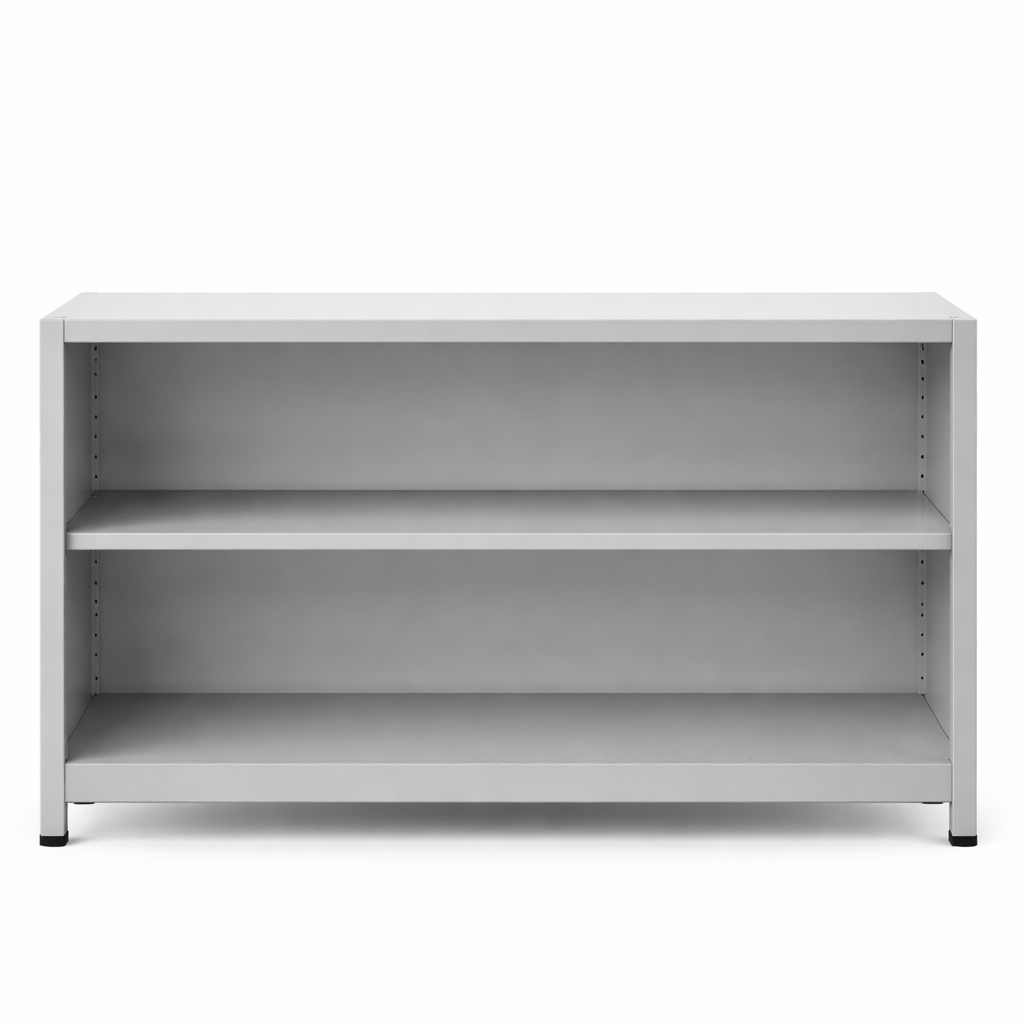 Librero abierto sin puertas tipo armario bajo. Diseño resistente, seguro y funcional para oficinas, escuelas, gimnasios o áreas industriales.