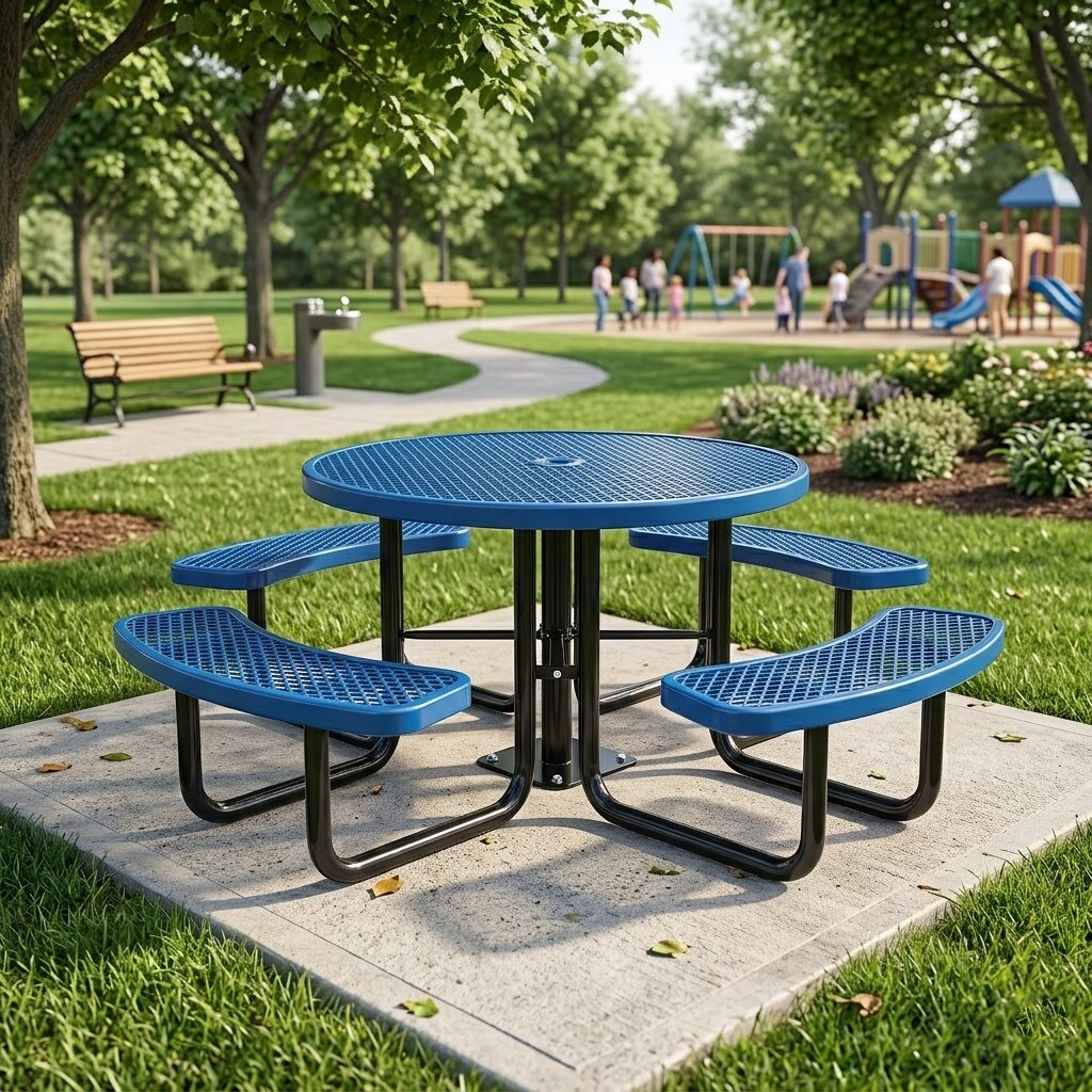 Mesa de pícnic para exteriores, diseñada para integrarse en parques y áreas comunes que demandan alta resistencia, funcionalidad y mantenimiento sencillo. Su construcción sólida y acabados durables aseguran un desempeño constante, manteniendo una estética limpia y ordenada.