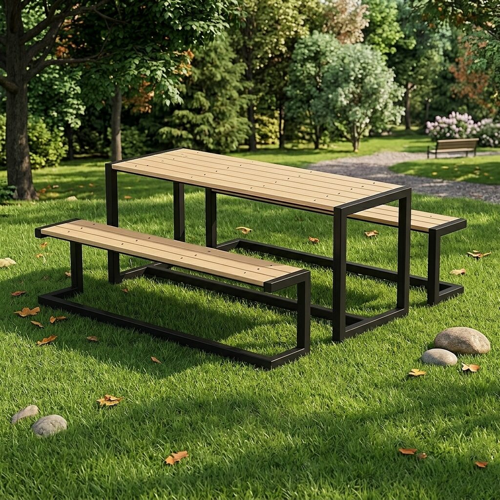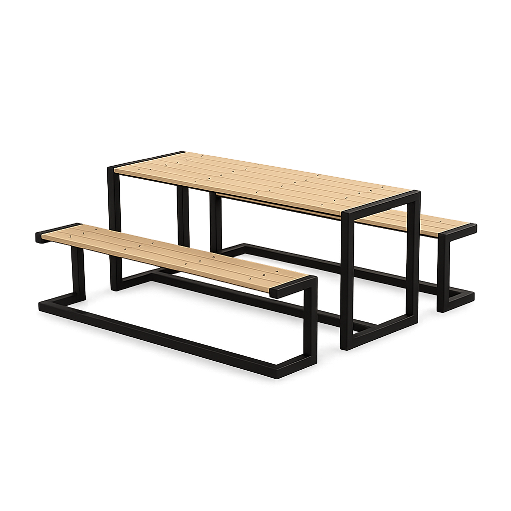 Superficie y asientos: elaborados en plastimadera, combinando la apariencia cálida de la madera con la resistencia y bajo mantenimiento del material plástico.