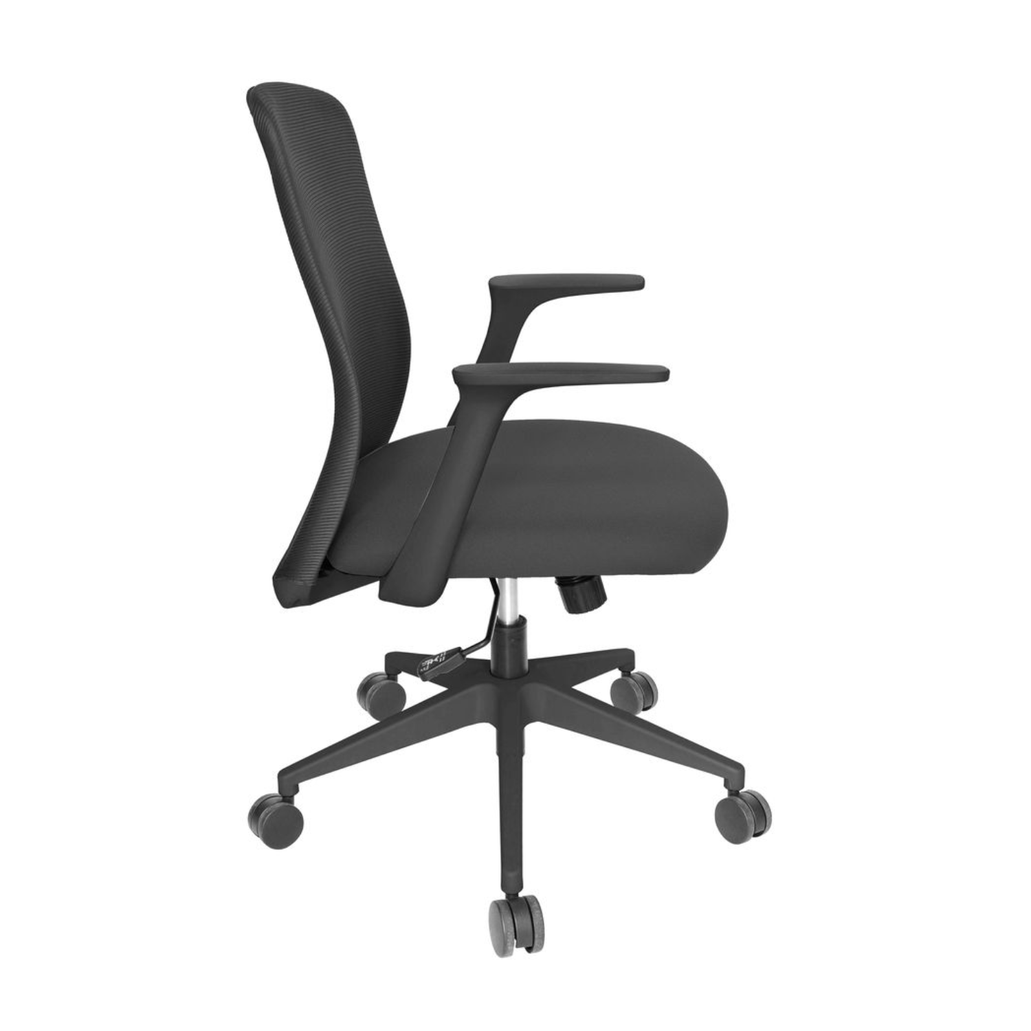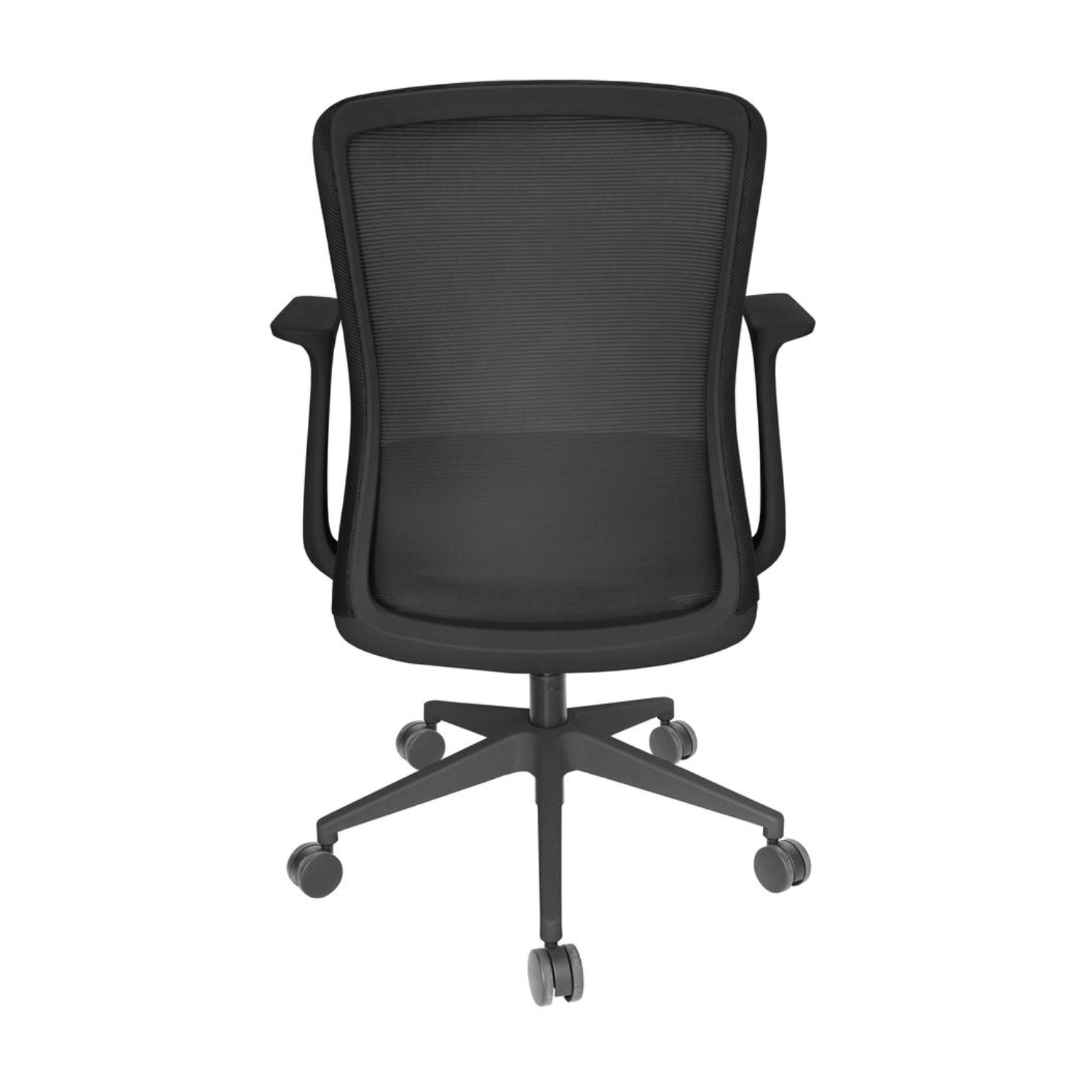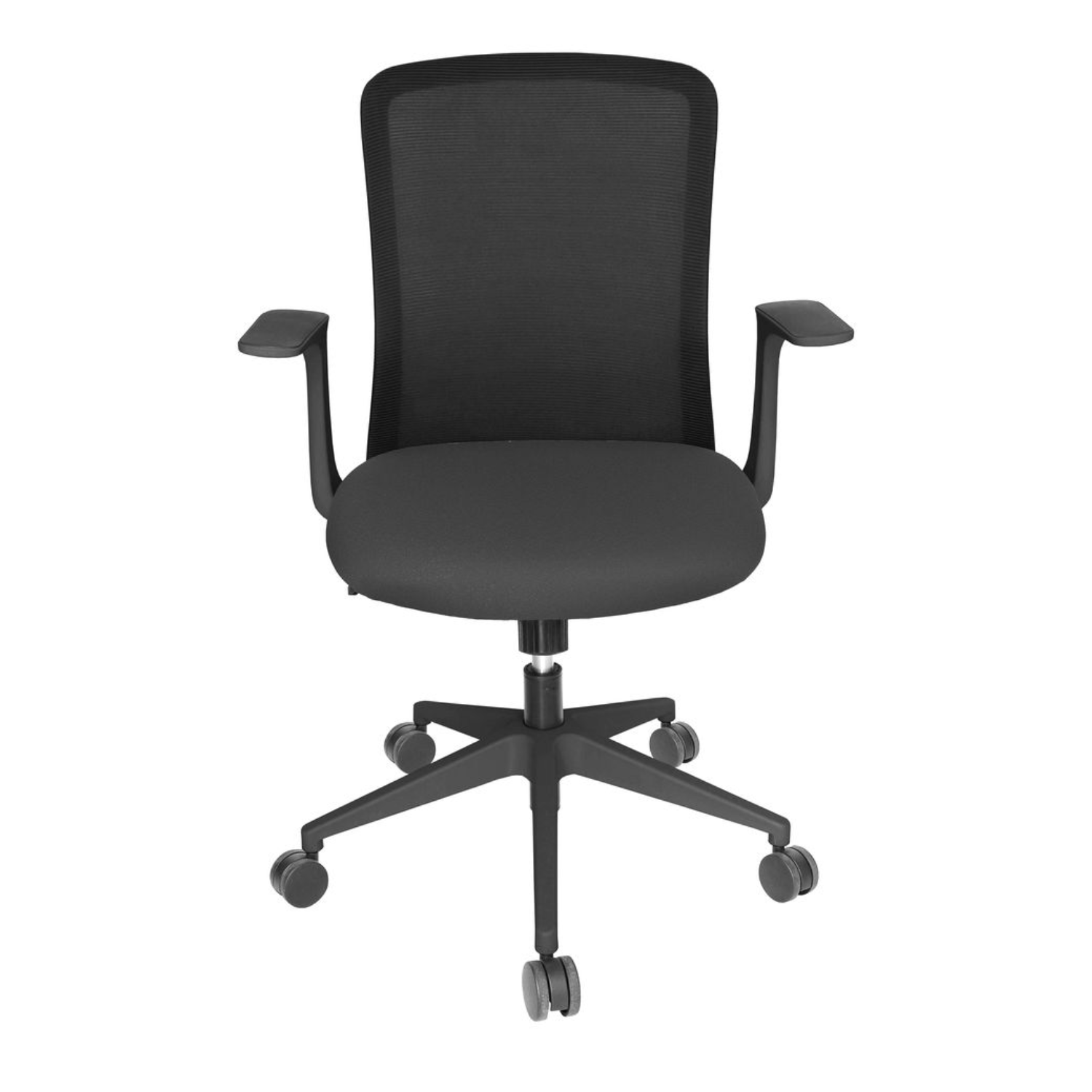 Respaldo: respaldo de malla de color negro y asiento tapizado en tela de color negro.