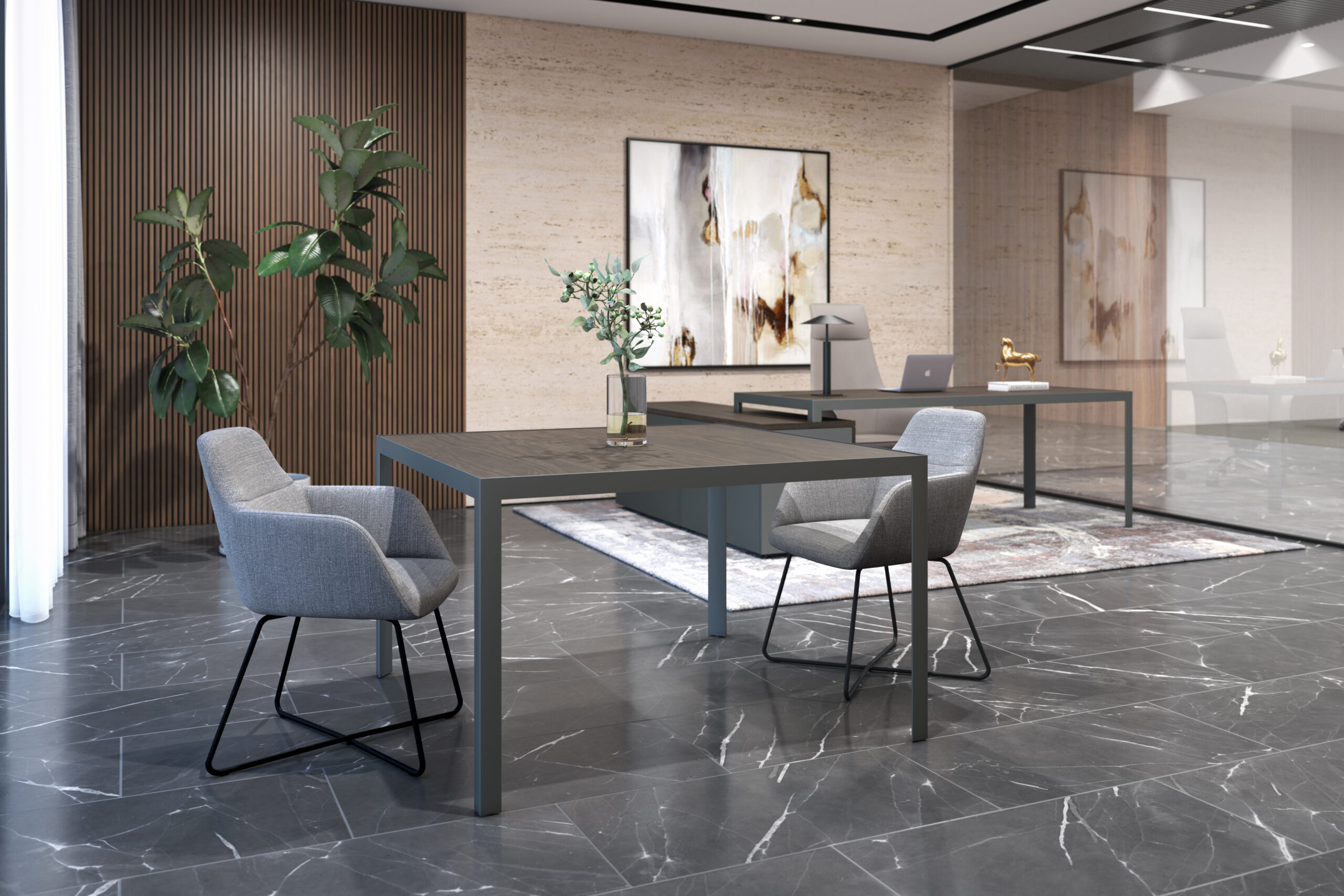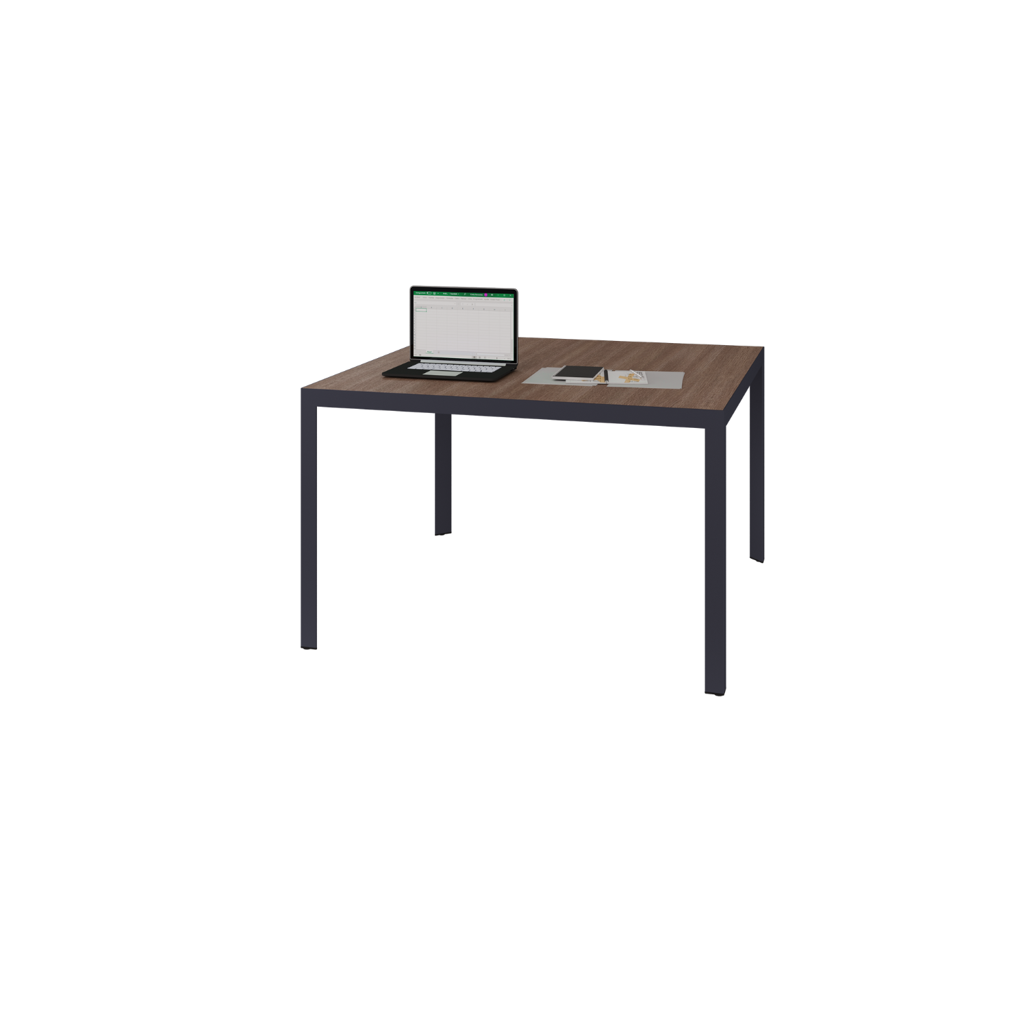 Mesa de juntas cuadrada, ideal para juntas operativas. Con estructura perimetral de aluminio con patas en acero. Diseño resistente, seguro y funcional para oficinas o escuelas.